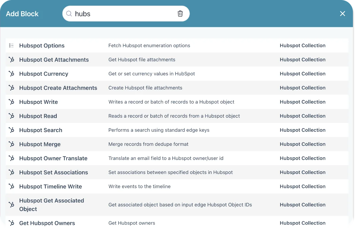 Build a collection of blocks that provide access to your platform for your customers. Above is a collection of HubSpot blocks, for example.