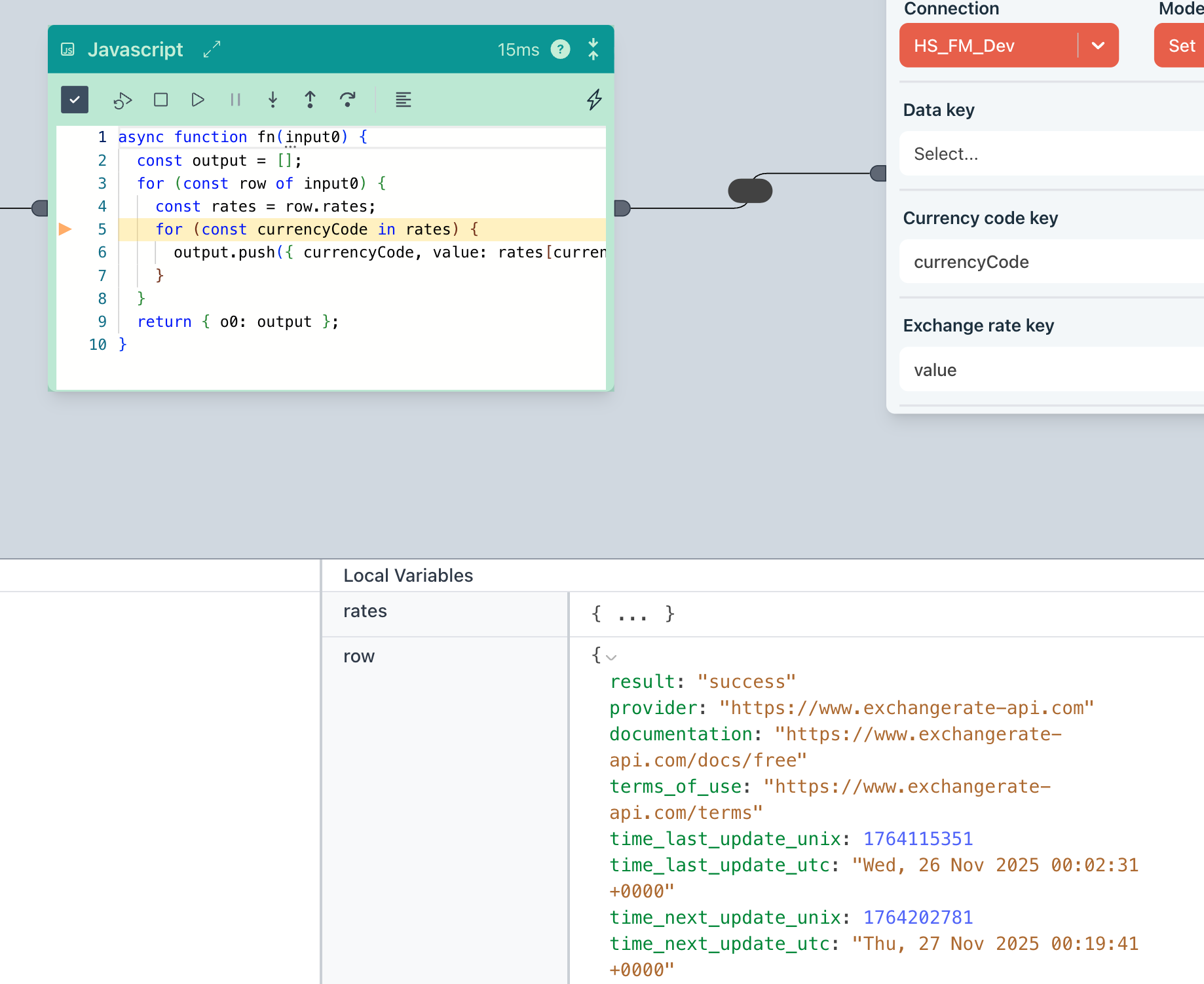 - Transform - perform data mappings of recalculations using Javascript snippets